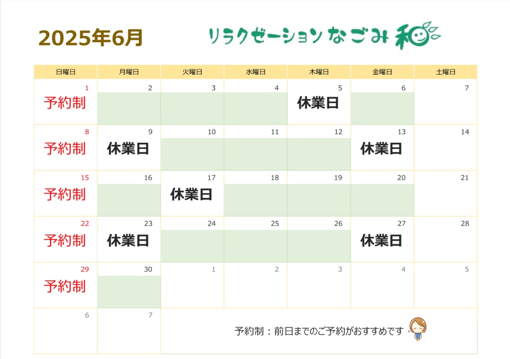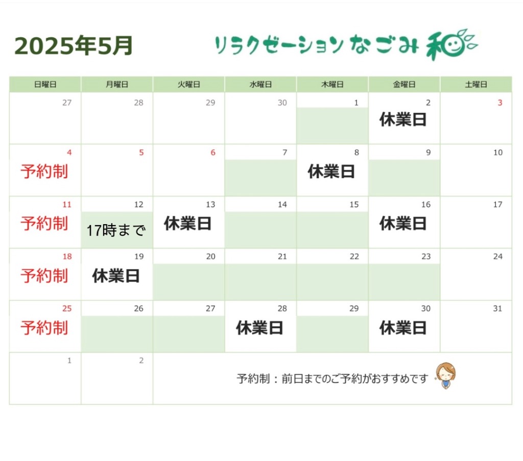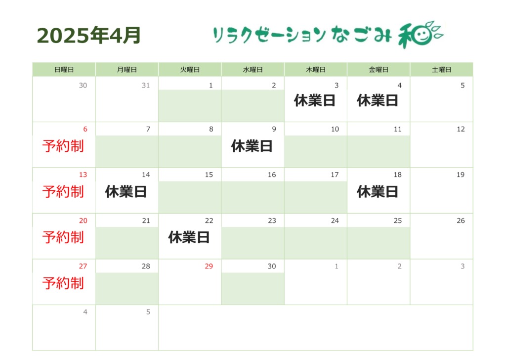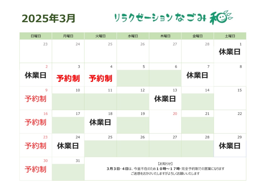 2025/06/26 7月のお知らせ🗓️ 12日(土)は16時〜21時の予約営業になります🙏ご迷惑をおかけしますが、よろしくお願いします🙇♀️急に暑くなり身体がついていけず、しんどさ・だるさなど悲鳴をあげてる方が多いです💦無理せず、身体のメンテナンスを🙌ご来店お待ちしております🍀 2025/05/29 6月のお知らせ🗓️ 急に暑くなったと思えば寒くなったりで身体がついていかず、不調を訴える方が増えています😭💦身体に疲労が溜まりしんどい状態で過ごすより、早めのケアを心がけてください🍀時間外での相談もお気軽にご相談ください🙌 2025/04/28 5月のお知らせ🗓️ 今年のGWは長期休暇の方は少ない感じですね😭4月から環境の変化で知らずうちに疲れが溜まってくる時期です😣💦お仕事の方も遊びに行かれる方も無理せず、身体が悲鳴を上げる前にぜひ一度リフレッシュしに来てください🙌✨ご来店お待ちしております🙇♀️ 2025/03/27 4月のお知らせ🗓️ 最近は寒さも落ち着き、暖かく過ごしやすいですね🌸と言っても、まだ油断はできないですが…😂寒い⇄暑いの気候の変化に身体はついていけず、疲れがでやすい時期です💦無理せず早めのケアを心がけてください🙌疲れがとれない・身体が重だるい・むくみなどお気軽にご相談ください🍀 2025/02/18 3月の予定🗓️ 3日、4日は10時〜17時の予約制になります。ご不便をおかけしますが、アプリ・公式LINEよりご予約をお願いします🙇♀️5日以降の平日はペアでのご予約可能です🙌お気軽にご相談ください✨ PREV 2 3 4 NEXT