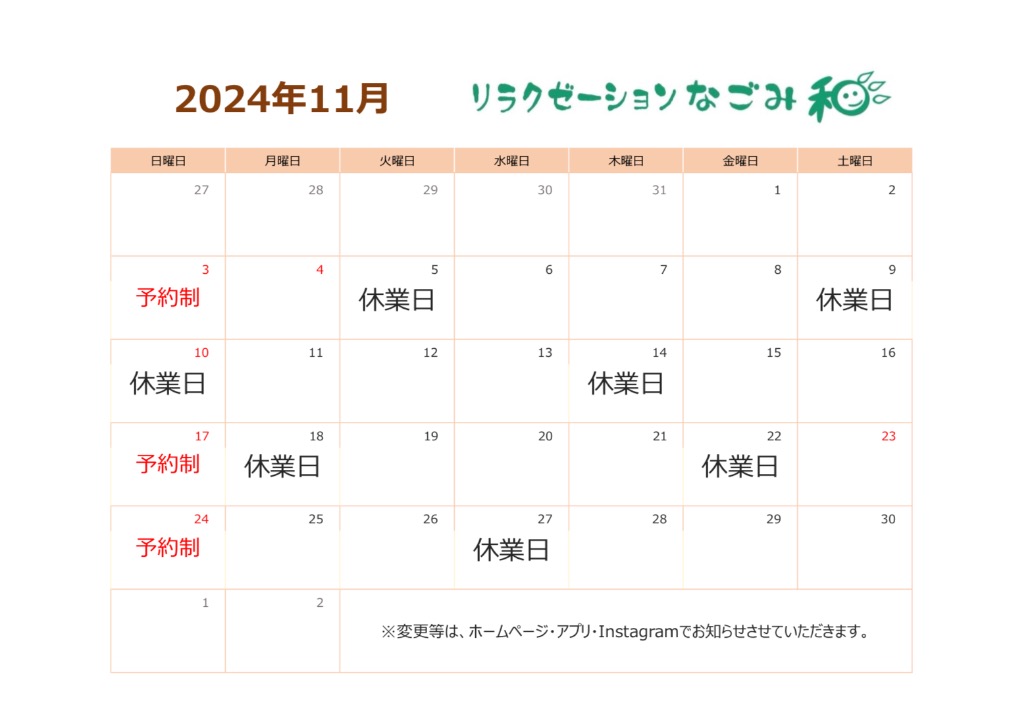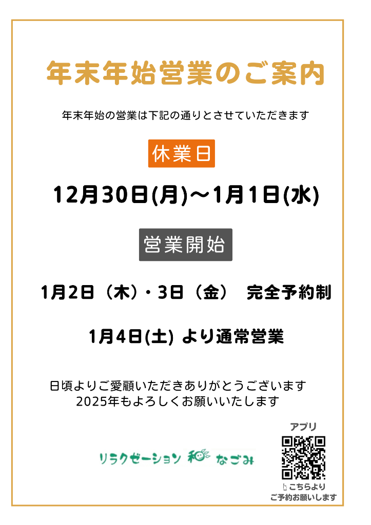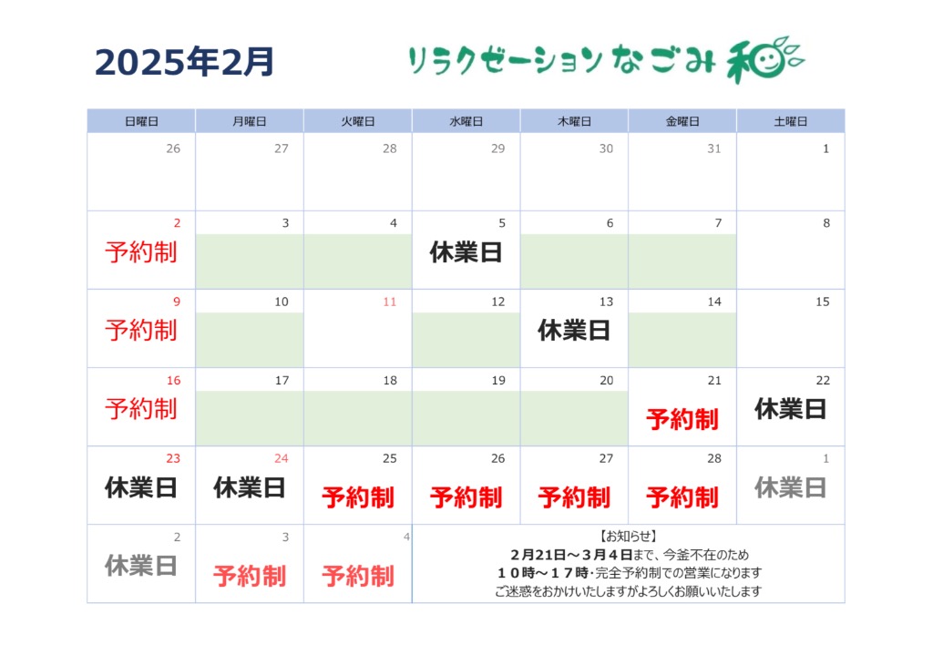 2025/01/21 2月の予定🗓️ 緑枠の日はペアでのご予約可能です🙌お気軽にご相談ください✨※2月21日〜3月4日まで10時−17時、水曜のみ→12時−17時完全予約制での営業になりますご予約は、アプリ・公式LINEでお願いしますご不便をおかけしますが、よろしくお願いいたします 2025/01/07 1月の予定🗓️ 今週は寒くなる予報です💦寒さ❄️や運動不足により凝り固まった身体や、眼精疲労の疲れなど、無理せず早めのケアを🙌ご予約お待ちしております🍀 2024/12/29 2024年もありがとうございました🙇♀️ 今年もたくさんのお客様にご来店いただき、心より感謝申し上げます年明け1月2日、3日は予約制、4日より通常営業になります来年も『1人1人のお身体の悩み』に寄り添い、技術向上に努めてまいります2025年も変わらぬご愛顧をいただけますようお願い申し上げます良いお年をお迎えください🍀 2024/11/28 12月・年末年始のお知らせ🗓️ 12月30日〜1月1日 休業日1月2日・3日 予約制4日より 通常営業 を予定しております🙌※年末、連休前はご予約が取りにくくなります。時間外で対応可能な場合もございますので、お気軽にご相談ください。 2024/10/29 11月の予定🗓️ 来月の予定です🙌日中は過ごしやすく、朝晩は肌寒く感じる日が増えましたね🍁季節の変わり目で体調を崩しやすい時期でもありますので、少しでも不調や違和感を感じたらお気軽にご相談ください🙌時間外でも可能な限り対応させていただきます😊 PREV 3 4 5 NEXT
