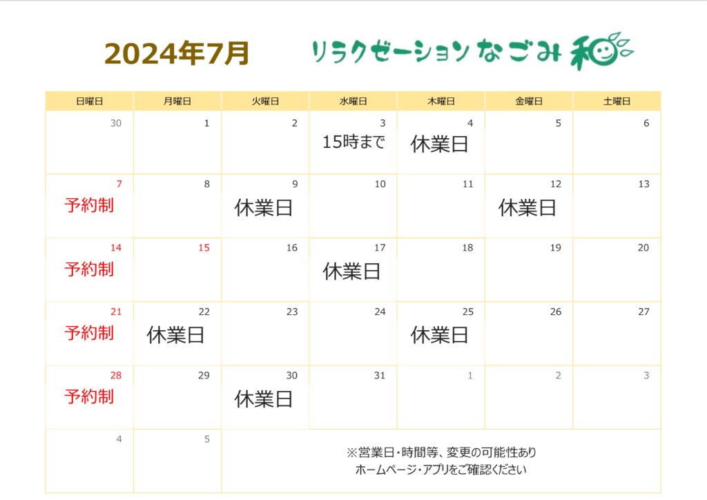 2024/07/09 当面の間、臨床休業とさせて頂きます いつも当店をご愛顧いただき、ありがとうございます。 誠に勝手ではございますが2024年7月10日(水)より当面の間臨時休業とさせていただきます。 お客様には大変ご迷惑をおかけいたしますが何卒ご理解のほどよろしくお願いいたします。 営業再開につきましては、改めてホームページなどにてご案内をさせて頂きます 2024/06/27 7月のお知らせ 梅雨入りしジメジメした日が続きますね💦暑さでダルさ・疲れなどが溜まりやすい時期です😭無理せずお早めのケアを心がけてください🍀仕事で間に合わないけど、限界😵って方もおられると思います。時間外での相談も受け付けておりますので、お気軽にご相談ください🙌※お応えできない場合もございます。ご了承ください。 2024/05/28 6月のお知らせ 早いものでもう6月😂6月2日-3日は連休になります。お気をつけください🍀日曜日は予約制での営業の為、前日で締め切る場合もございます🙇♀️最近の天気は不安定な日が多いですね💦寝ても疲れが取れない、気圧の変化で頭痛がするなど、身体の不調を放置せず早めのケアをおすすめします🙌皆様のご来店をお待ちしております🤗 2024/05/03 5月のお知らせ 5月4日(土)、24日(金)は17時までの時短営業になります🙌日曜日は予約制での営業になり、前日で締め切る場合もございます🙇♀️日中と朝晩の気温差があり温度調整が難しい時期なので、体調にはお気をつけください🤗身体に不調や違和感を感じたら、お気軽にご相談ください^ ^ お待ちしております🙌 2024/03/28 4月のお知らせ 少しずつ春を感じられる季節になりましたね🌸と言っても、まだまだ朝晩は冷える日も…体温調節が難しい時期ですが、体調にはお気をつけください☺️【4月のお知らせ】6日(土)〜8日(月)、23・24日(火・水)と連休になります🍀身体に不調や違和感を感じたら、お気軽にご相談ください^ ^ お待ちしております🙌 PREV 5 6 7 NEXT